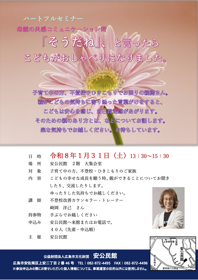 1/31 安公民館で講演します 投稿者: u65bwbh52026年1月18日2026年1月18日ブログ 安佐南区の安公民館のご依頼で講演させていただきます。ハートフルセミナー母親の共感コミュニケーションズ術子育て中の方、不登校やひきこもりでお困りの親御さん。親がこどもの気持ちに寄り添った言葉がけをすると、こどもは安心を感じ、自己肯定感があがります。そのための親のあり方とは、などについてお話します。楽な気持ちでお越しください。お待ちしています。 ▪️1月31日(土)13:30〜15:30▪️安公民館2階大集会室 広島市安佐南区上安2丁目2−46▪️参加費無料 お申込みは直接ご来館、またはお電話で